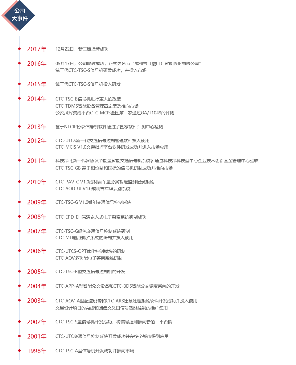 成利吉(廈門(mén))智能股份有限公司,成立于1998年,是國(guó)內(nèi)最早從事智能交通領(lǐng)域產(chǎn)品研發(fā)和應(yīng)用、專(zhuān)業(yè)智能交通核心軟件開(kāi)發(fā)、智能交通系統(tǒng)集成與運(yùn)營(yíng)服務(wù)的企業(yè)之一。公司于2016年5月正式更名為成利吉(廈門(mén))智能股份有限公司,并于2017年12月22日新三版成功掛牌。